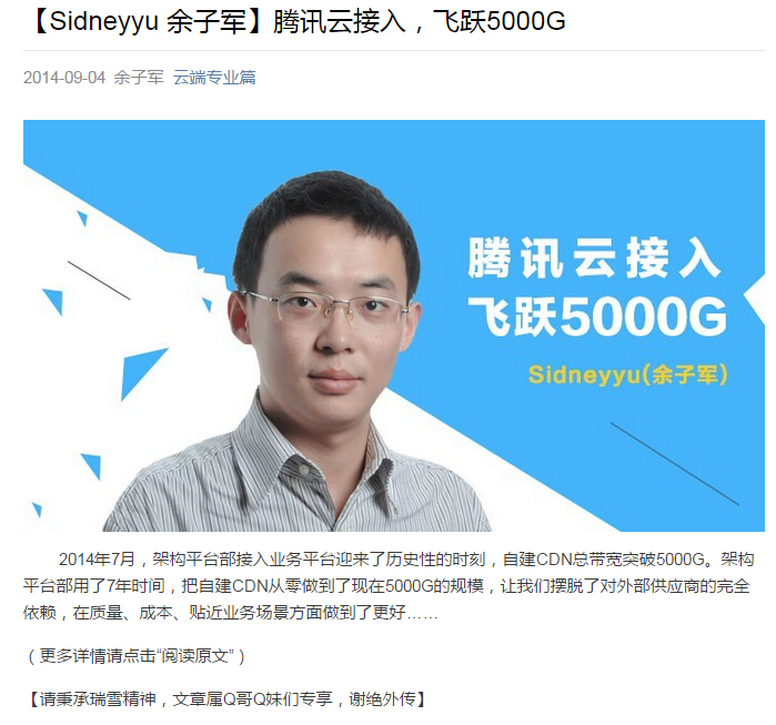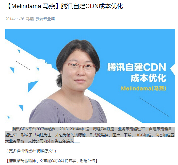 腾讯CDN平台2007年起步,2013~2014年加速,历经7年打磨,CDN业务带宽超过7T,自建带宽储备超过5T,形成了以自建为主,外包为辅的资源池。形成流媒体、图片、下载、UGC加速、动态加速五大业务平台,支持公司内外各类业务接入。详细参考: