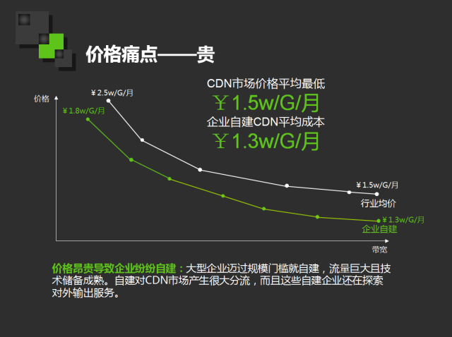 今天整个CDN行业最大的竞争对手其实并不是某一家CDN公司,而是各互联网公司的自建。现存的CDN商业模式下,以现有的成本来看,用户能够在CDN市场买到的最低的价格可能是1.5万/G/月的价格,而实际上很多互联网公司自建只需要1.3万/G/月。