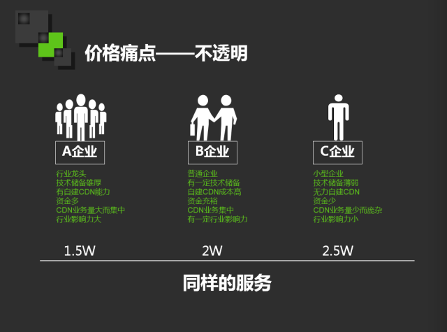 大型企业在采购CDN时拥有一定的话语权,可以协商之后用较低的价格采购,但是绝大多数企业在面对多重价格时并没有太多的话语权,没有经验的、或者经验不多的企业无法和CDN服务商斗智斗勇。