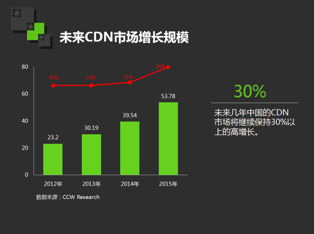 未来几年中国的CDN市场将继续保持30%以上的高增长,有很多人觉得CDN增长很快,而实际上,增长可能远不止这么多。今天的农村互联网方兴未艾,很多新兴的互联网企业正在把大流量的业务快速地带到农村。