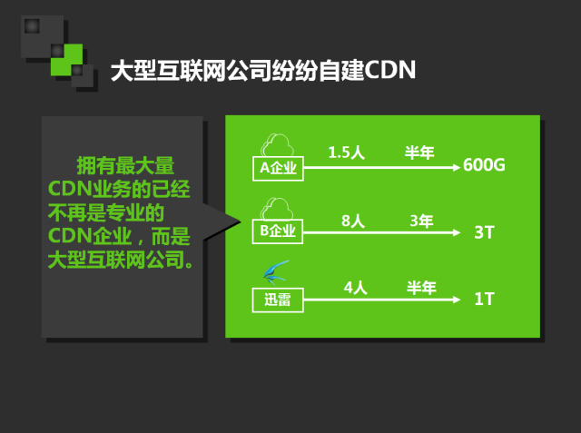 迅雷仅用4个人便在半年时间内自建1T规模的CDN;另一家互联网企业自建3T规模CDN也只用了3年时间和8个人力。这些公司原本做自建的初衷是想要作