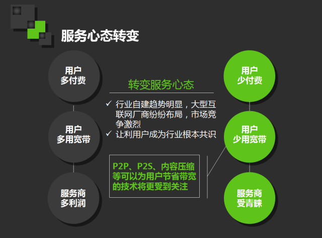 行业要越来越互联网化,最重要的是提升服务。现在的CDN行业做得还不够,因为跟CDN服务商的利益产生冲突:CDN服务商在想方设法的帮助用户省流量、省带宽的同时也在提升自身的技术实力。