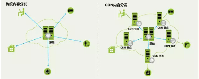 图1:传统分发模式与CDN分发模式对比图