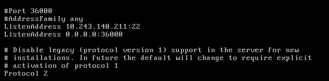 这样ssh就监听了 两个端口, port 22监听在10.243.140.211上, port 36000监听在本机所有IP0.0.0.0上