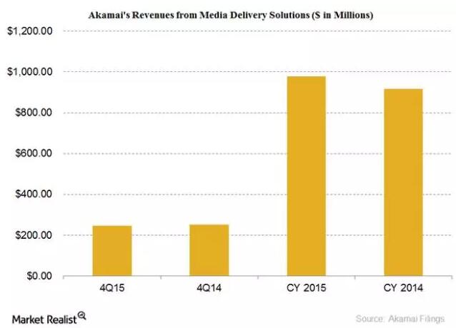 单从Akamai第四季度的收入来看,有明显上升,达到5.79亿美金,同比年增长率超过8%,每股收益均摊为0.49美金,同比下降9%,而此前分析师在第四季度预测的是5.68亿美金,每股收益0.62美金,基本超出预期。综合全年,Akamai在2015年收益达到22亿美金,同比增长12%,每股收益均摊为1.78美金,同比下降3%。