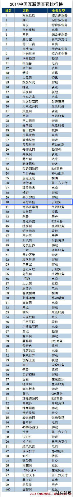 近日,《互联网周刊》评出“2014年度中国互联网百强排行榜”,网宿排名第40位,是榜单前50名中,唯一一家专注于云服务的互联网业务提供商。互联网百强榜单排名基于各互联网企业2014年的主要产品服务、市场份额、战略布局、发展前景、行业或社会贡献度等方面进行综合考量后,评选而出。